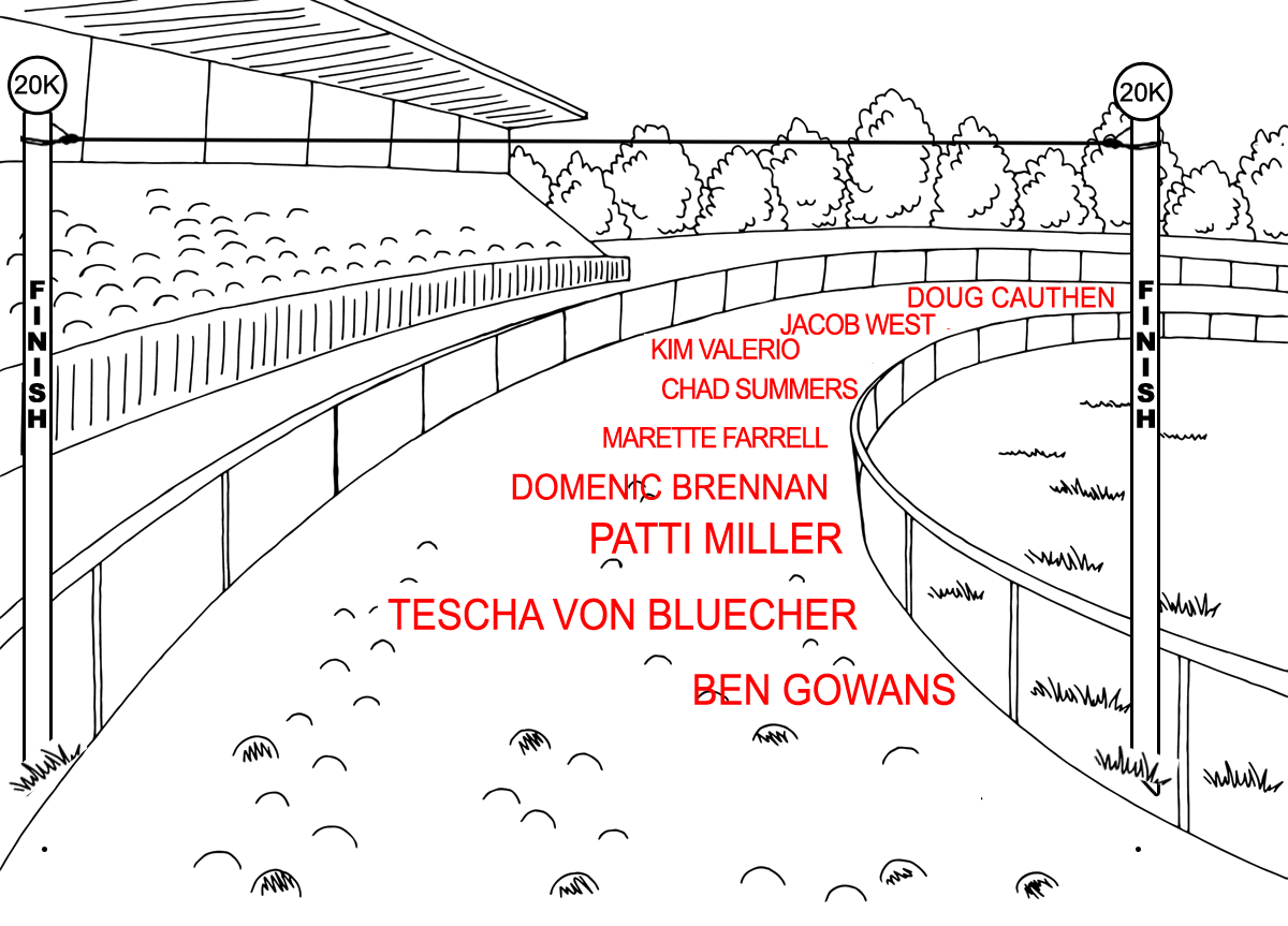 The field is strung out approaching the wire. BEN GOWANS leads the charge with TESCHA VON BLUECHER moving up willingly to challenge. PATTI MILLER is being asked for her best a path or two off the rail and DOMENIC BRENNAN is attempting a rail skimming inside move. Rounding the turn and under a drive are MARETTE FARRELL, CHAD SUMMERS and KIM VALERIO with JACOB WEST and DOUG CAUTHEN in pursuit.